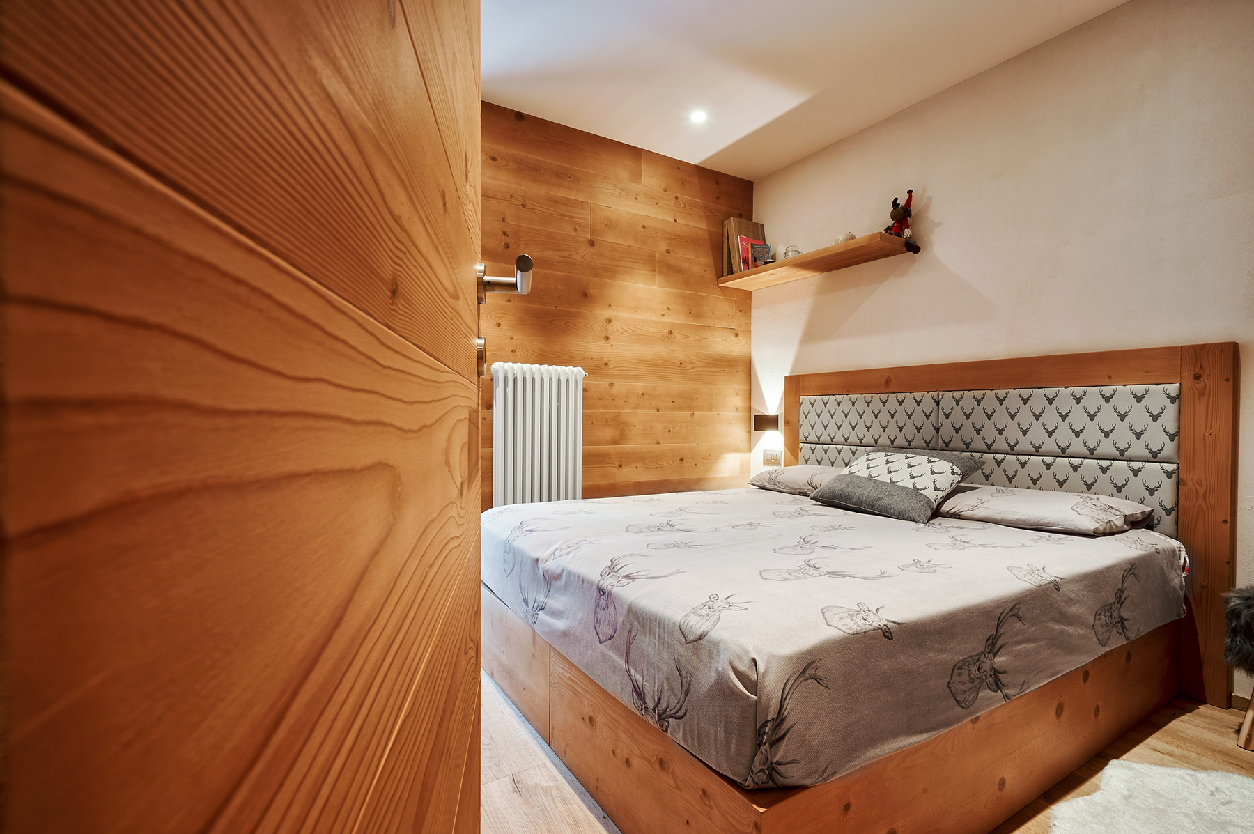 Armadiature contrapposte a tutta altezza delimitano il disbrigo che porta alla zona notte. Immagini epiche della località di San Martino in veste invernale posizionate nella zona d’ingresso danno il benvenuto all’ospite.