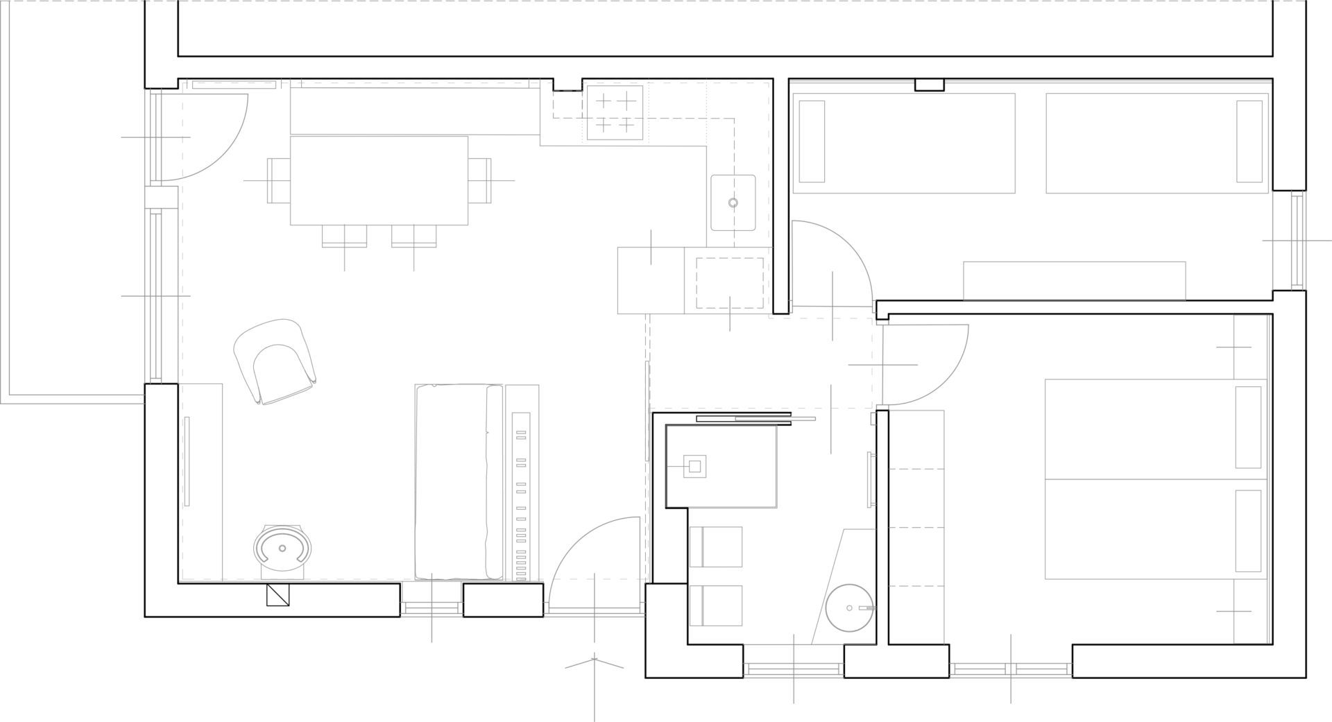 Il pavimento in doghe di legno di rovere dal colore bruciato è presente in tutto l’appartamento.