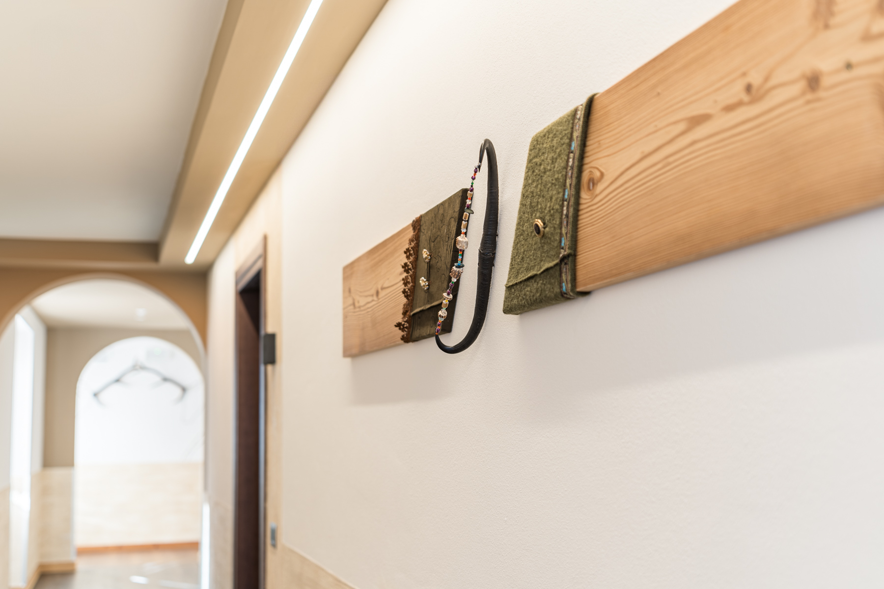 All’arredo, realizzato interamente in legno di larice termo trattato, sono stati inseriti alcuni elementi in Valchromat che lo caratterizzano rendendo così ogni camera diversa dall’altra per la cromia di questo materiale moderno.