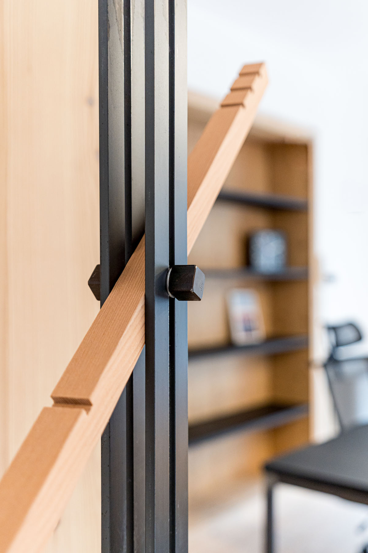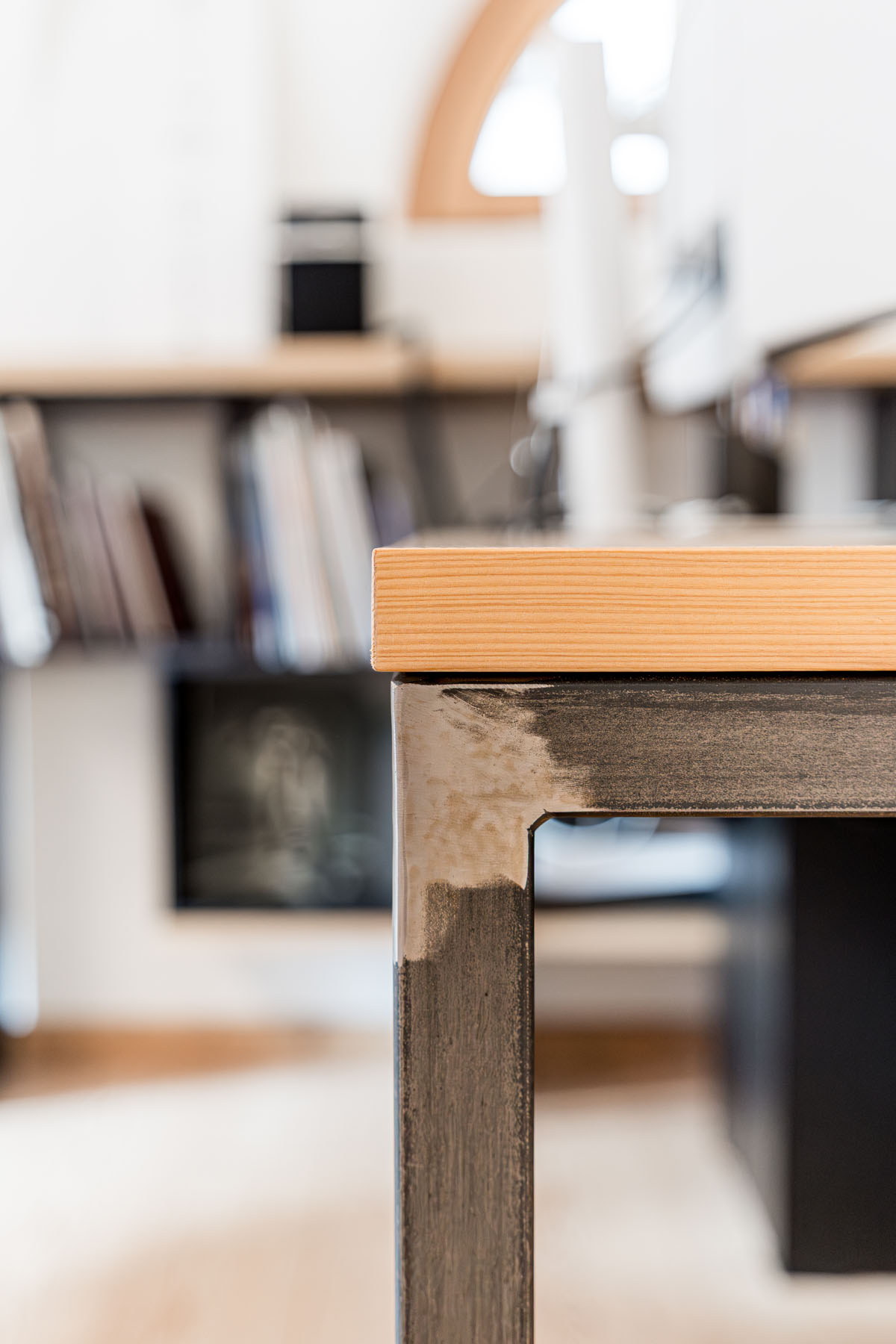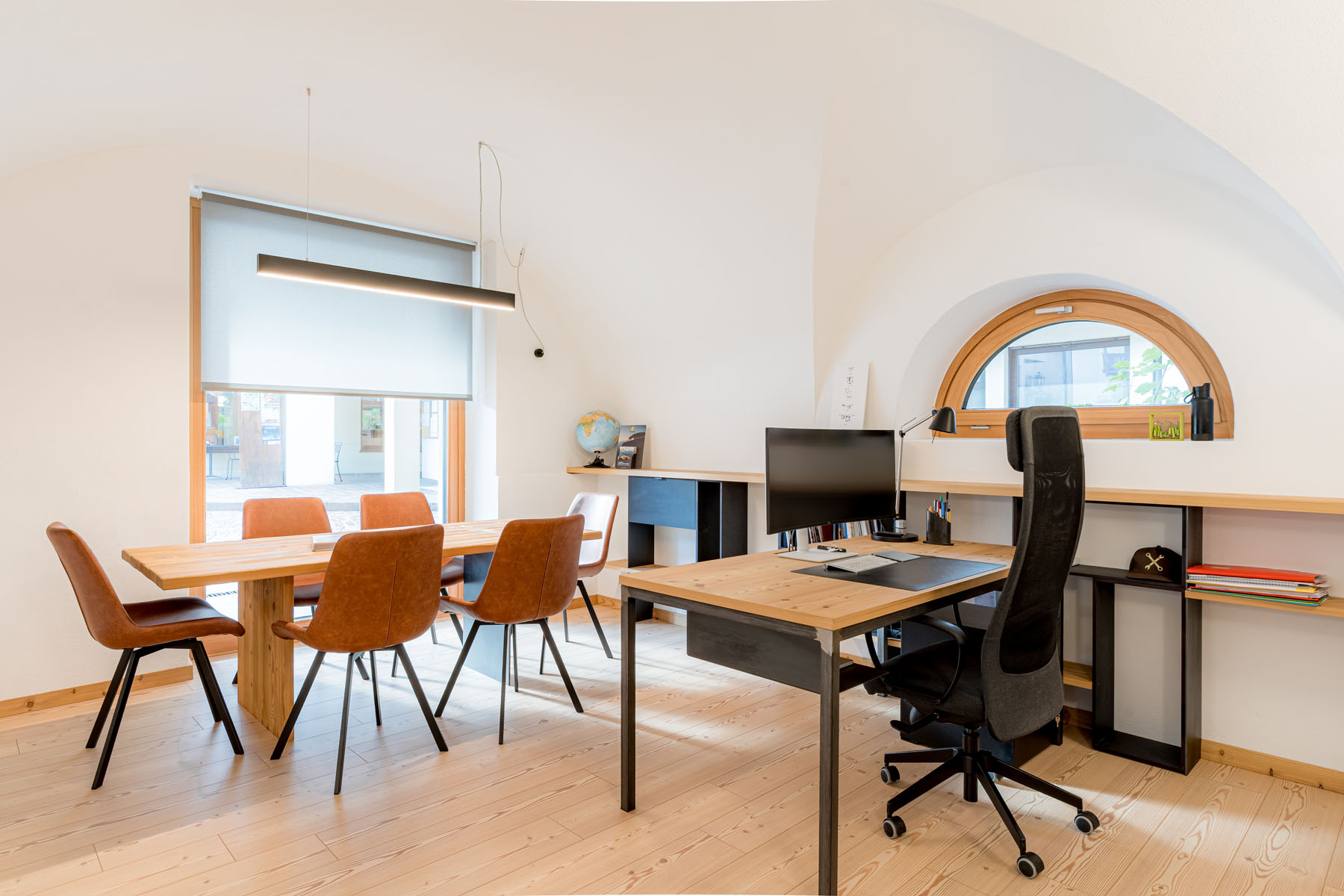 Tre i materiali proposti e utilizzati in tutti gli arredi. Il legno di larice termo trattato, la lamiera tubolare e il Valchromat nero. La loro mescolanza dona agli ambienti un aspetto tecnico, elegante e caloroso, con un’impronta unica adatta per uno studio che si occupa di design a 360°.