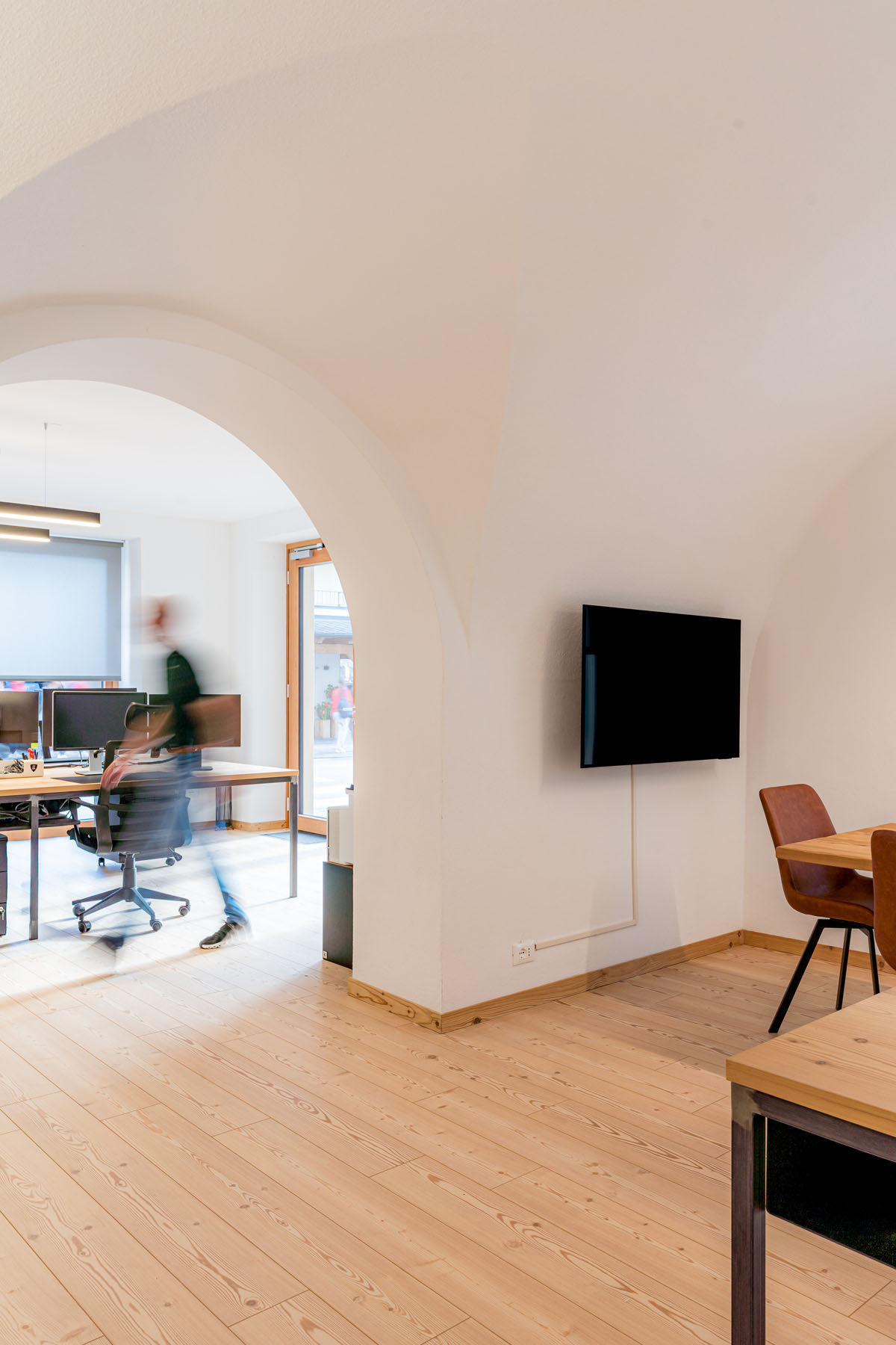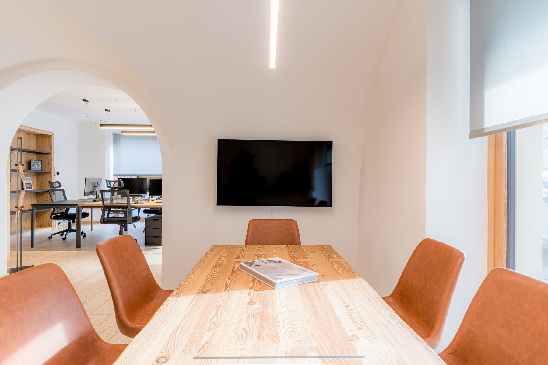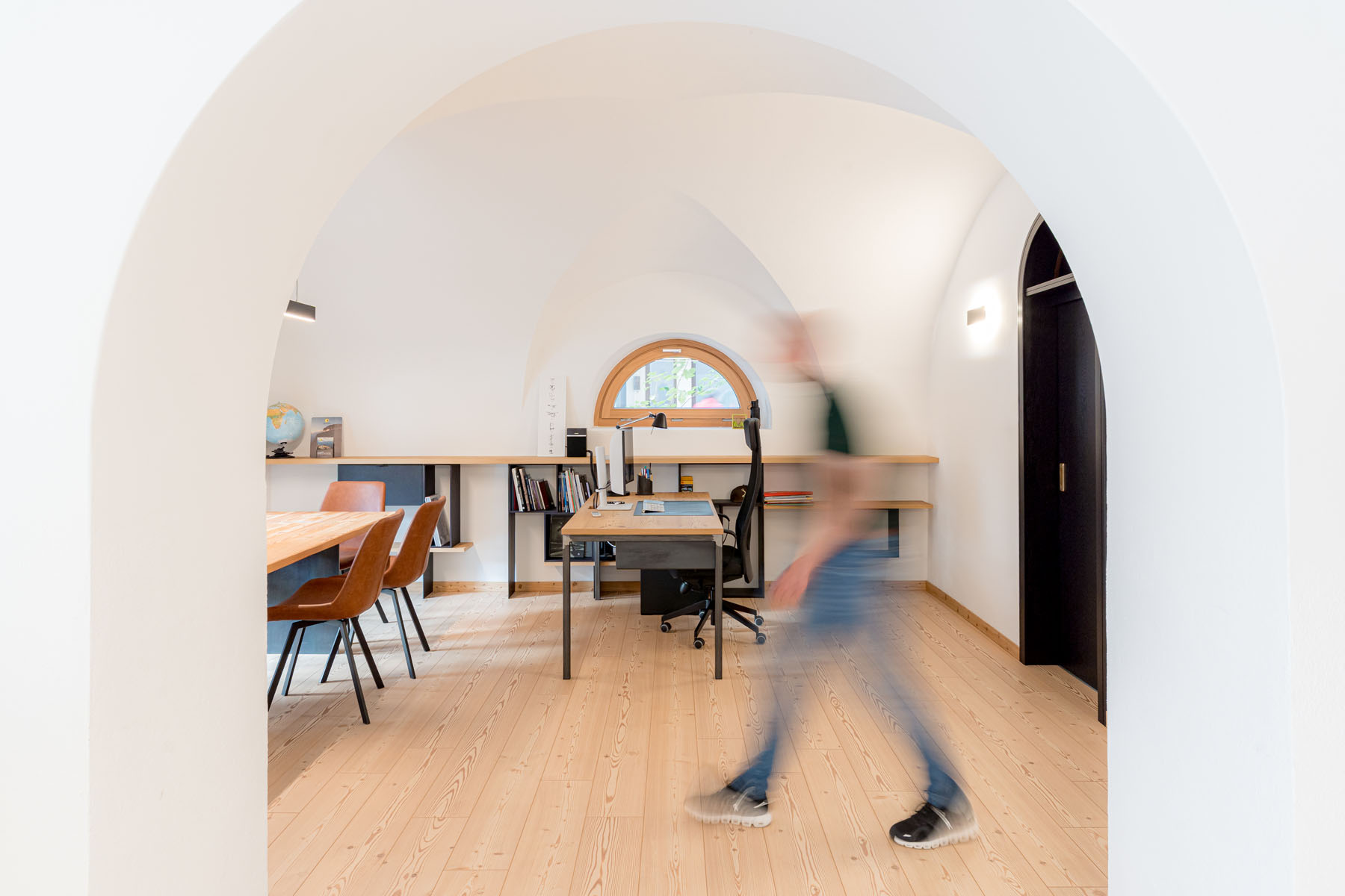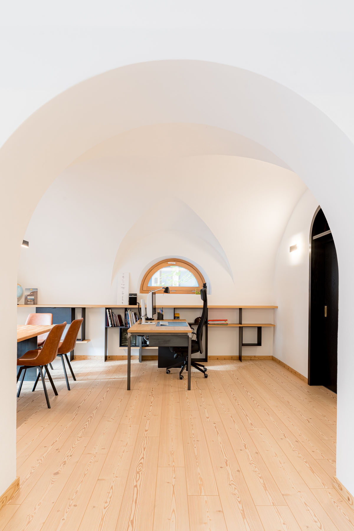 Il nuovo studio, suddiviso in due ambienti principali che entrano in connessione tra loro attraverso un importante arco centrale, si caratterizza da una prima zona operativa, vero e proprio cuore pulsante dello studio e da una seconda zona, più riservata e adibita anche a spazio riunioni, contraddistinta da uno storico soffitto a volte che la impreziosisce.