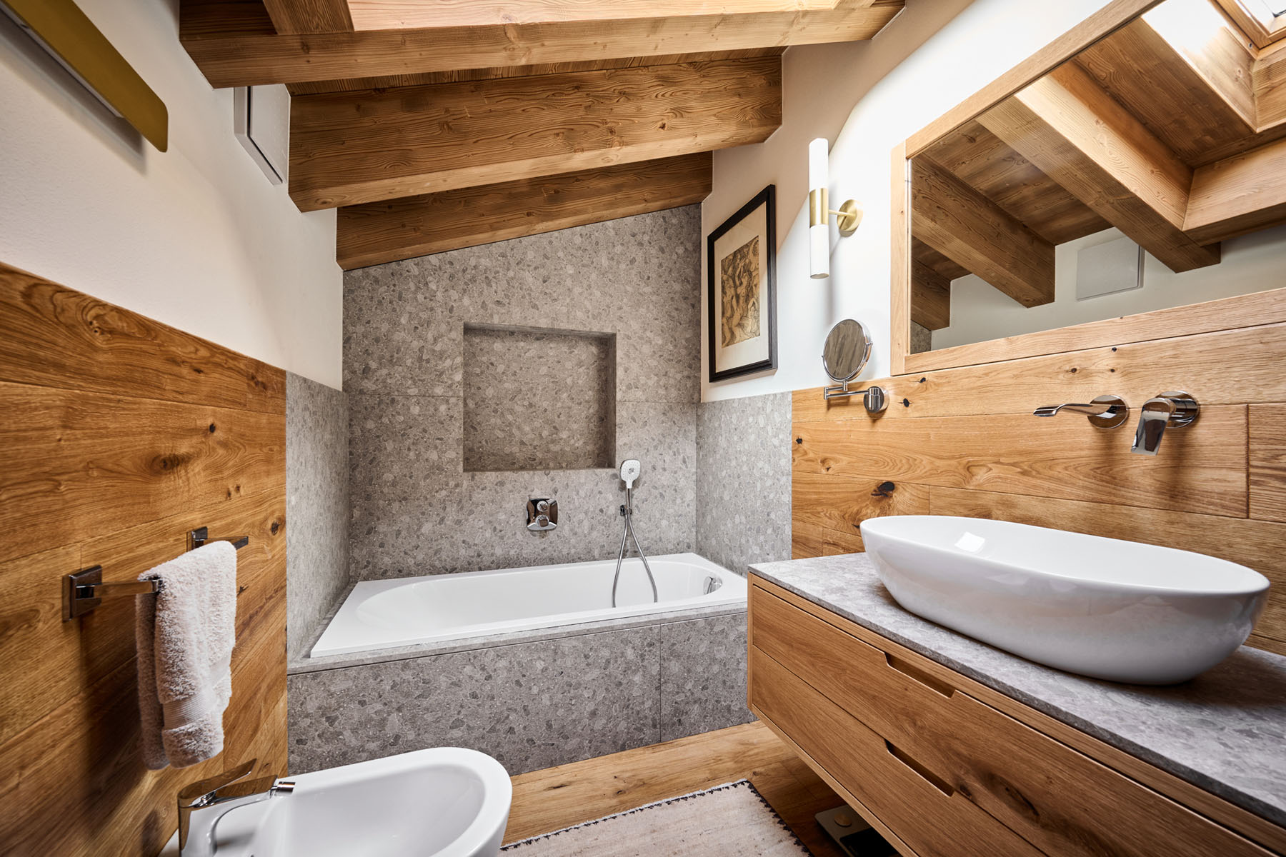 Le boiserie in abete termo trattato si sposano bene al pavimento e agli arredi in rovere spazzolato, connubio di colorazioni calde tipiche degli chalet di montagna. Dettagli in ottone si ritrovano un po’ ovunque, dai corpi illuminanti alle maniglie in una mescolanza di colori e finiture classiche ed eleganti.